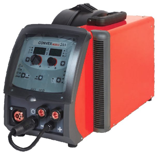 Powerful welding equipment in the size of just one wire feeder unit: this is the main peculiarity of CONVEX MOBILE series, innovative multiprocess synergic power sources for welding in MIG/MAG, MMA and TIG with “Lift” mode. Versatile, easy-to-carry and user friendly, CONVEX MOBILE equipment are greatly appreciated, also thanks to their high technological conception, anywhere high quality welding is required and are ideal for on-site work, maintenance job, car body repair and light fabrication work. CONVEX MOBILE PULSE, because of its additional Pulse and Dual Pulse processes, grants high quality performance on all materials and particularly on stainless steel, zinc coated and aluminium, by greatly minimizing any reworking job caused by spatters. CONVEX MOBILE 251, with single phase input power, have PFC facility which optimizes the amount of energy consumption by allowing their use, at maximum power, on 16 A fuse mains and with power generator sets without any problems